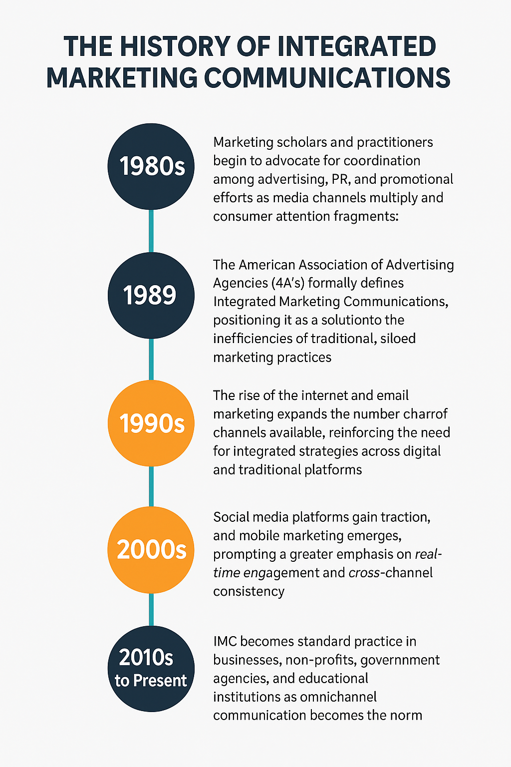 • 2010s to Present – IMC becomes standard practice in businesses, non-profits, government agencies, and educational institutions as omnichannel communication becomes the norm.