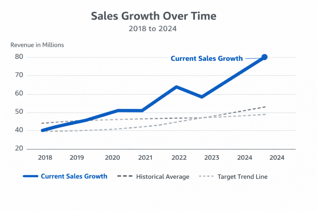 In a line chart showing sales growth, the main trend line should be visually stronger than reference lines or historical averages.